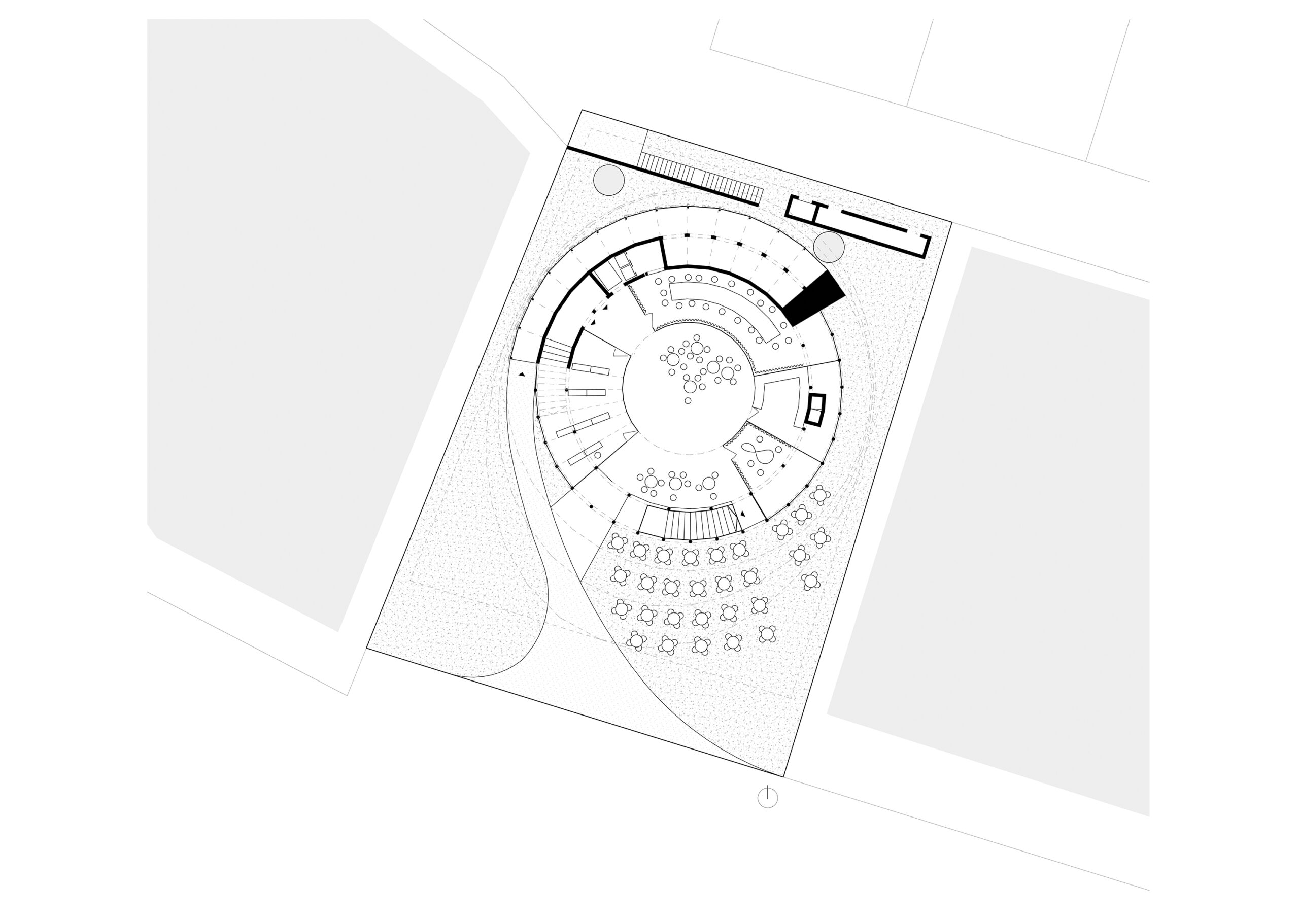 Silueta pavilonu je signifikantní. Zmrzlé gesto trajektorie pohybu – spirály – explicitně reaguje na vnitřní uspořádání sochající vnější formu domu. Bezbariérová spirálovitá rampa výstavních prostor se obtáčí kolem koncepčního středobodu, jímž je dutý tubus multifunkčního auditoria. To se svým vnitřním průměrem patnáct a půl metru stoupá do výšky dvanácti metrů nad úroveň terénu. Společně s ním se zvedá výstavní rampa, jejíž pohyb kopíruje i rampa se sedadly pro návštěvníky tvořící hlediště uvnitř auditoria, do nejž lze vstoupit z několika bodů celé spirály.