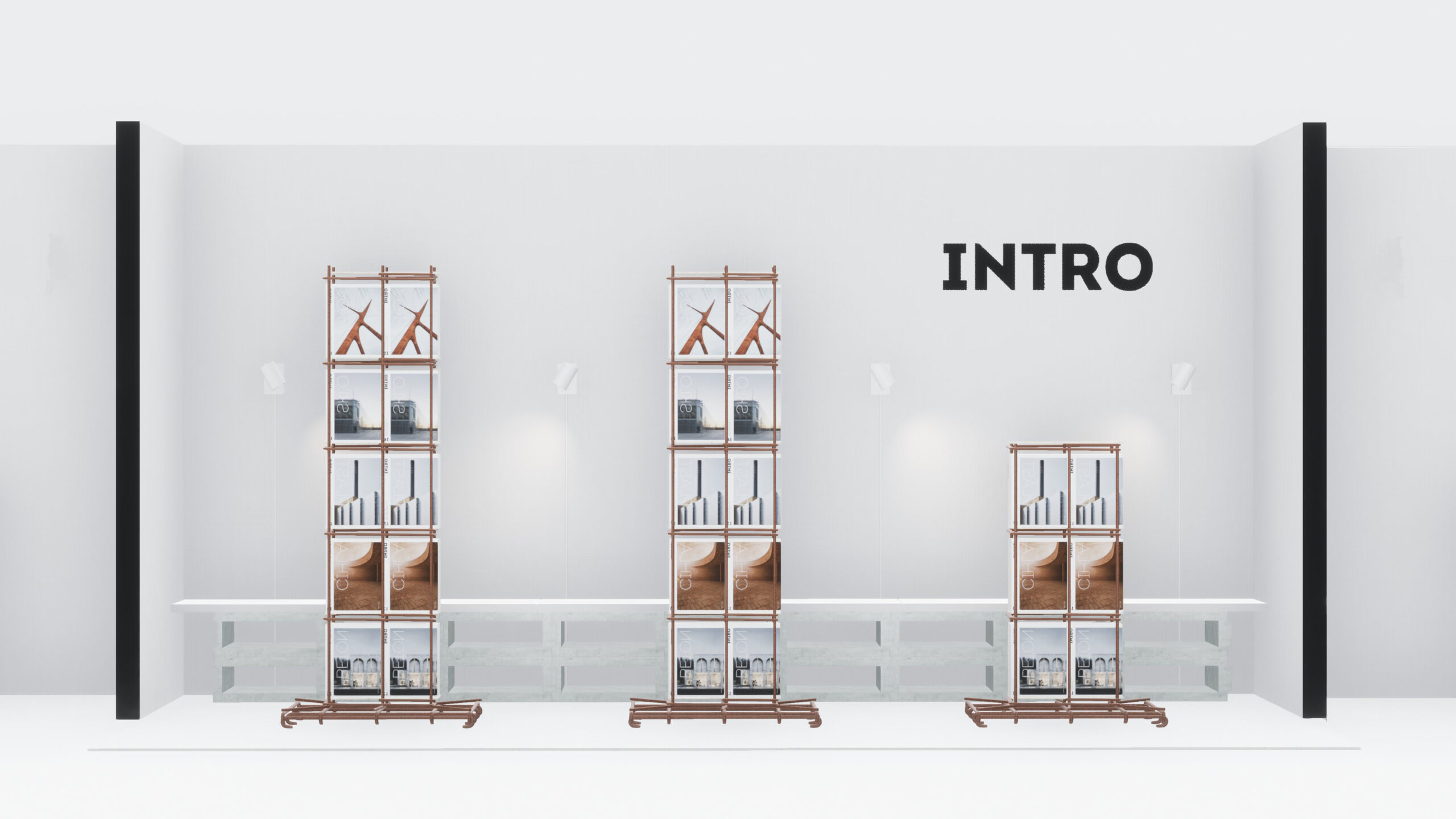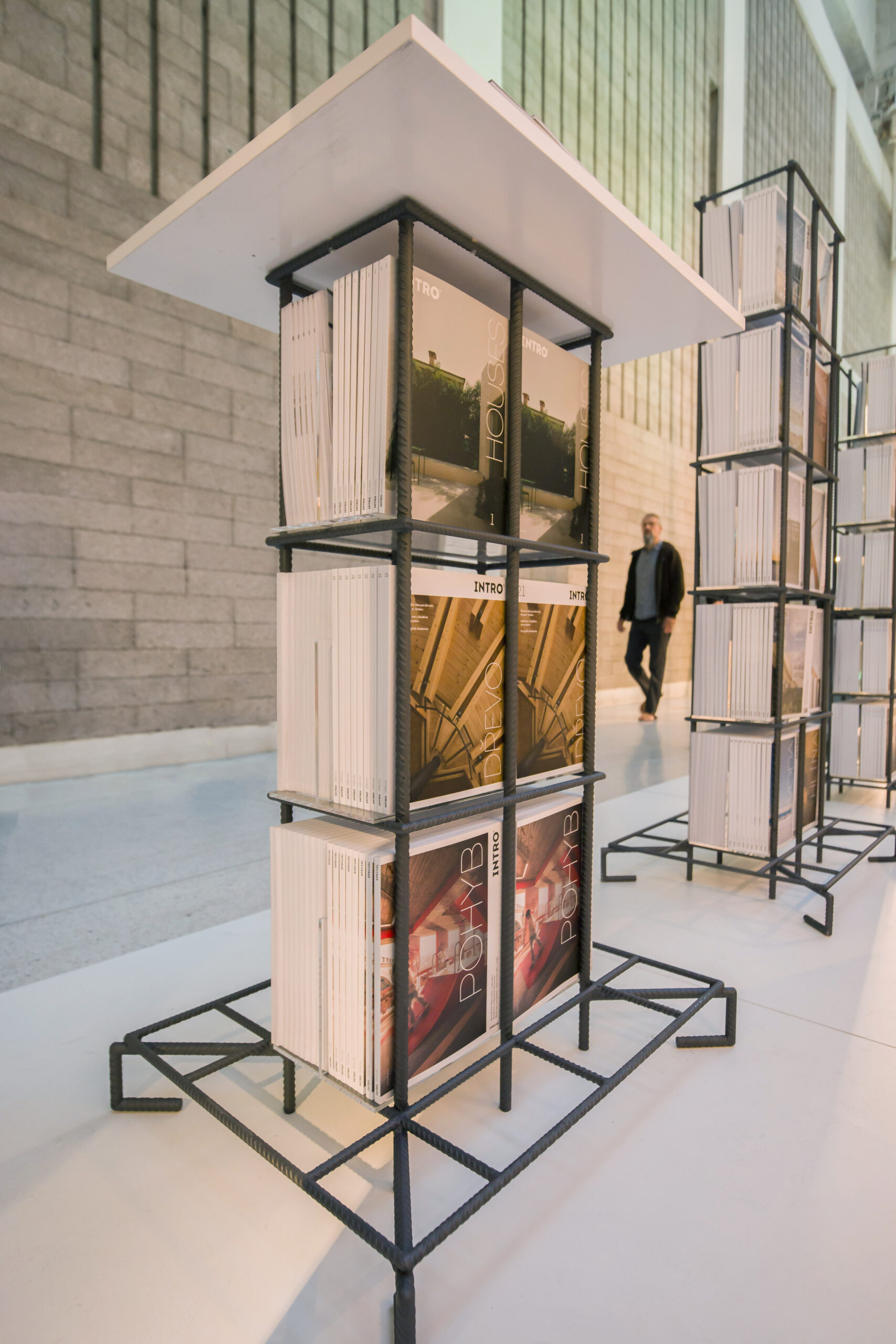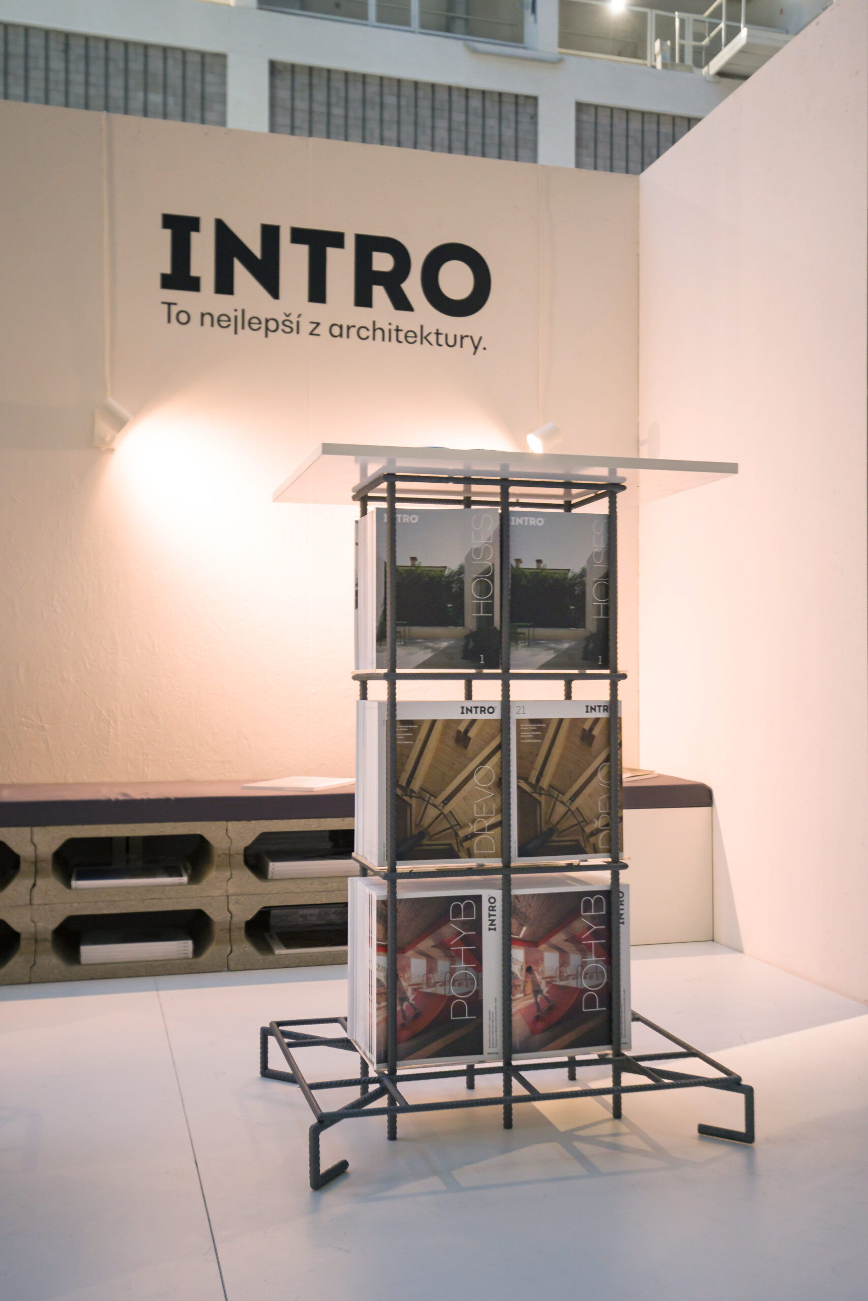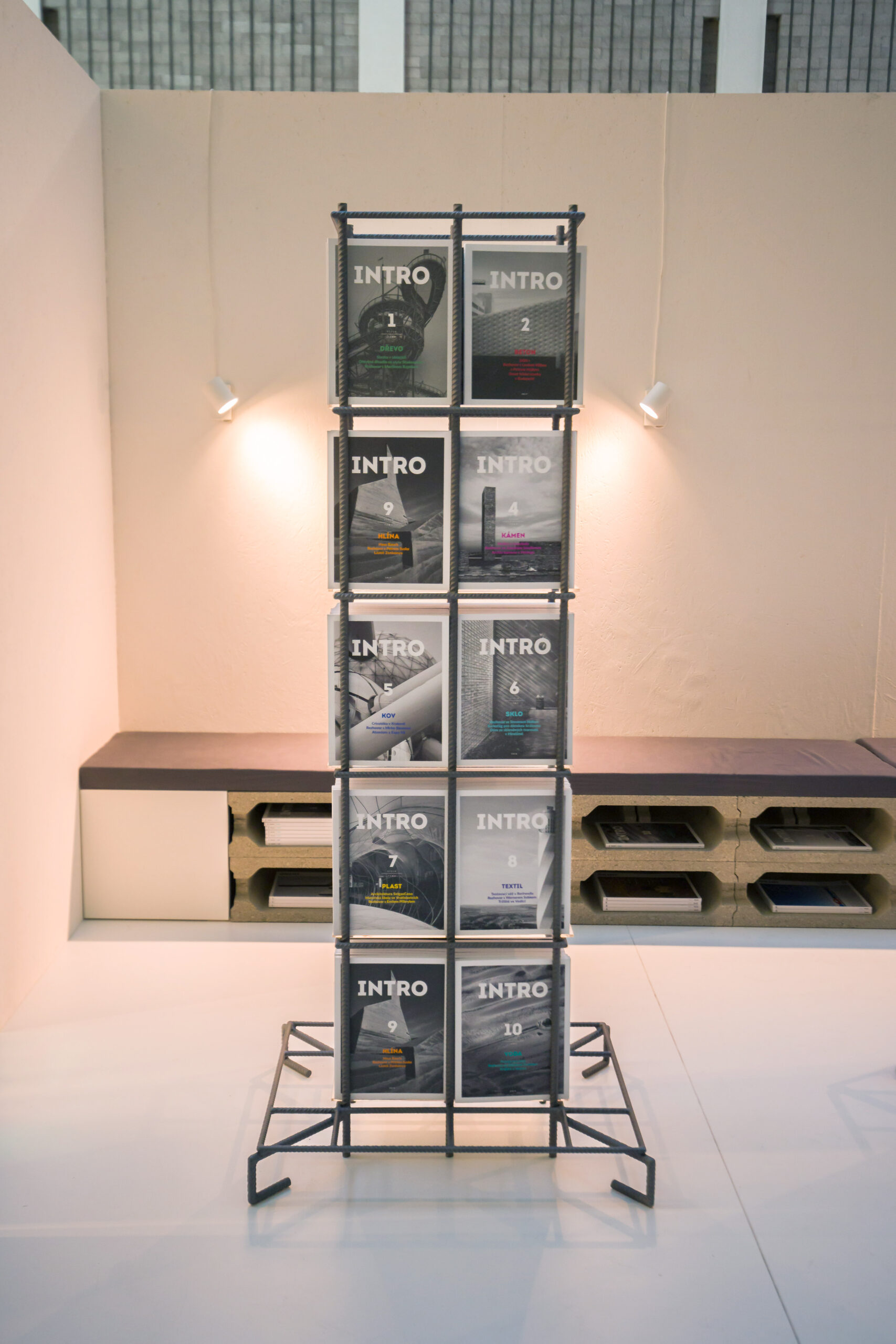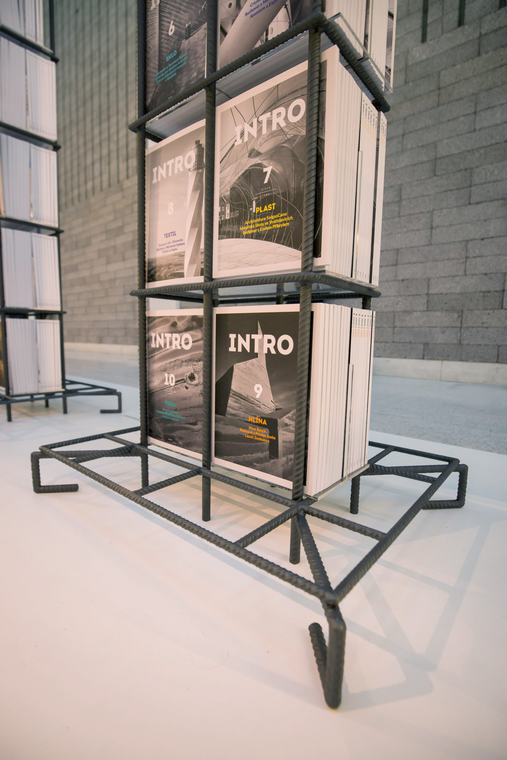 Všech jedenadvacet obálek regulérních čísel, pět speciálů a první díl INTRO HOUSES jako by levitovalo v útrobách betonářské výztuže. V nosných pilířích architektury, ve kterých beton nahradil obsah časopisu. S pečlivostí vytvářené periodikum odolávající tlaku.